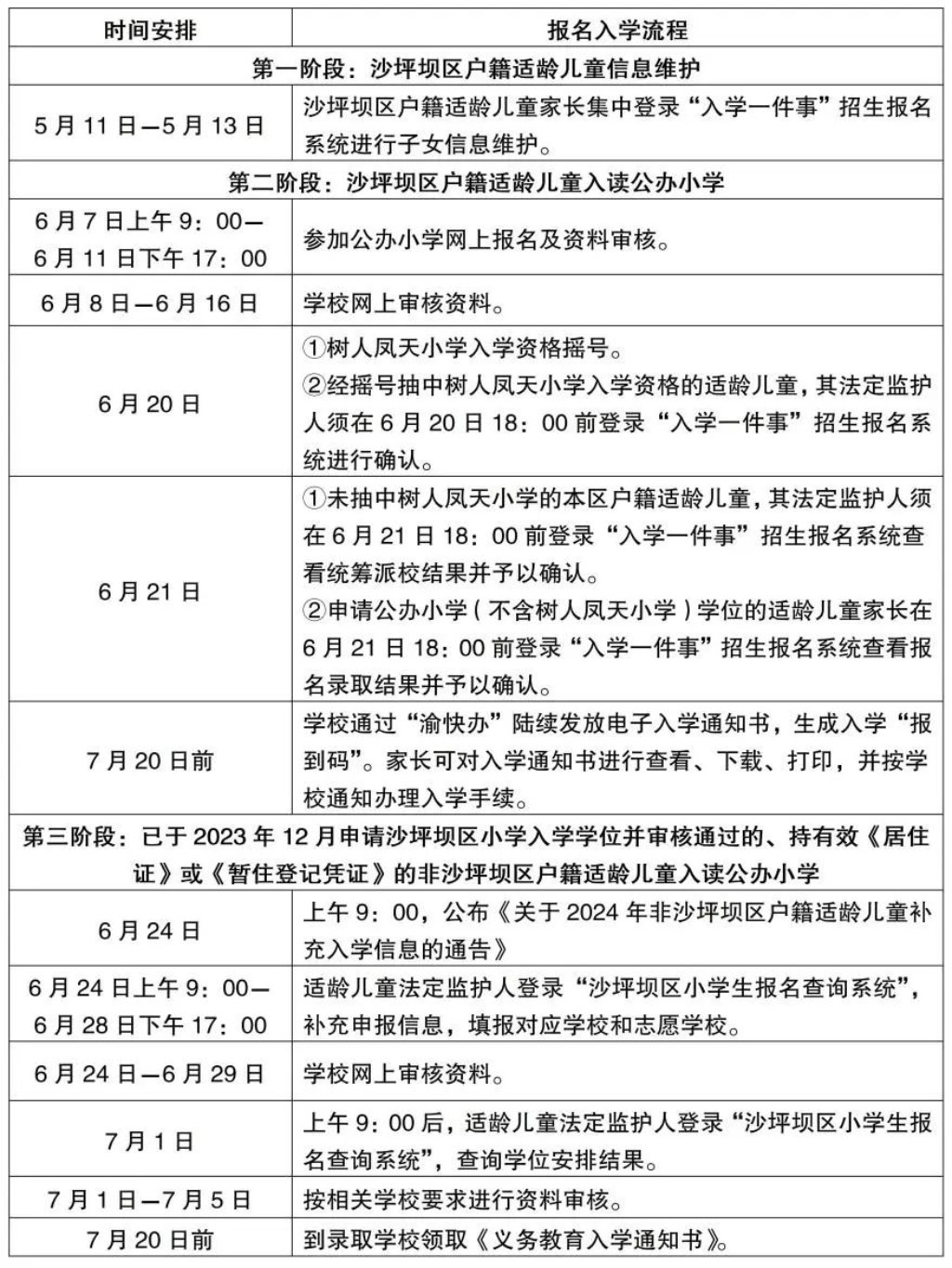 30?問:2024年,沙坪壩區(qū)公辦小學(xué)一年級報名入學(xué)需關(guān)注哪些重要時間點?