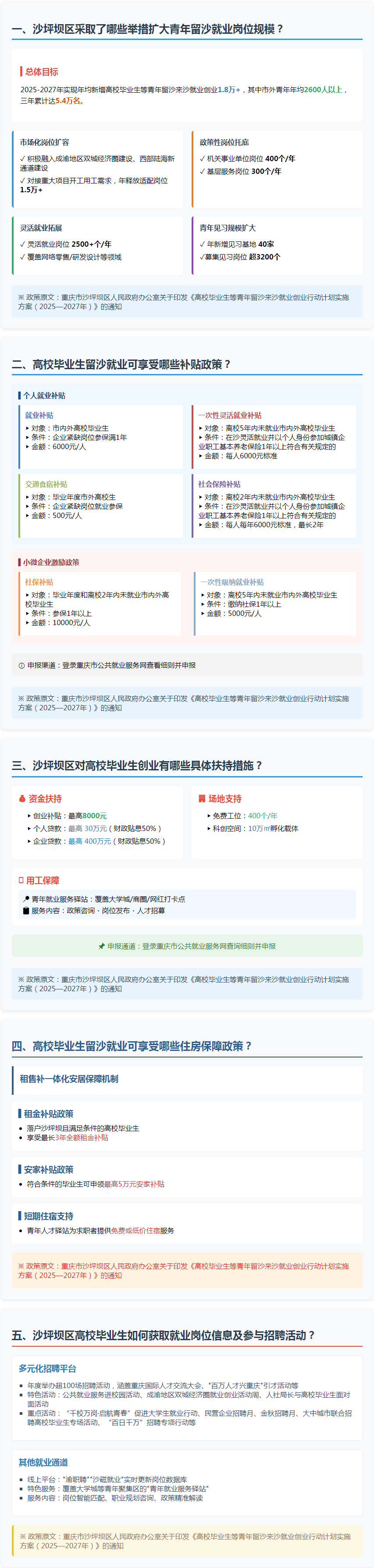 政策原文:重慶市沙坪壩區(qū)人民政府辦公室關(guān)于印發(fā)《高校畢業(yè)生等青年留沙來沙就業(yè)創(chuàng)業(yè)行動計(jì)劃實(shí)施方案(2025—2027年)》的通知