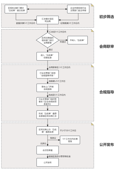 (四)公開發布。區司法局將匯總后的“白名單”推薦名錄向社會公開,征求各方意見,公示時間不少于30日。企業及公眾對“白名單”推薦名錄存在異議的,應在公示期限內以書面形式向區司法局或行業主管部門提出。區司法局或行業主管部門應當在收到異議后,5個工作日內作出處理、答復,必要時,可按規定組織聯審會商、開展專家論證或風險評估。